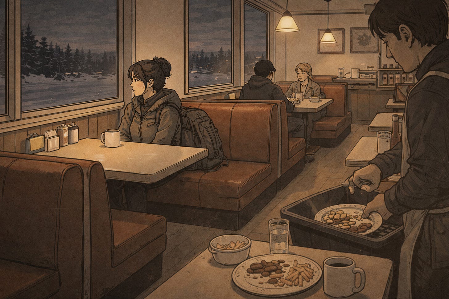 She sat in the booth, her hands still slightly curled like she was holding something that wasn’t there anymore.