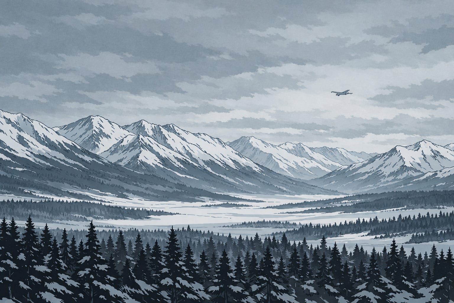 An endless expanse of white and dark timber stretched beneath the sky. Mountains cut through the horizon, and wind moved across the surface in long, invisible currents. There were no roads, no structures, no sound but the wind. A small plane sliced through the sky.